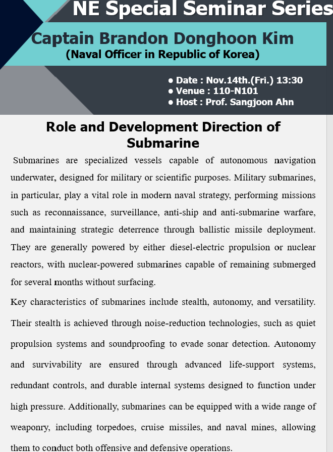 Role and Development Direction of Submarine – Captain Brandon Donghoon Kim(Naval Officer in Republic of Korea) 2025.10.31 Date 2025-11-14 13:30:00 Lecturer Captain Brandon Donghoon Kim(Naval Officer in Republic of Korea) Venue 110-N101